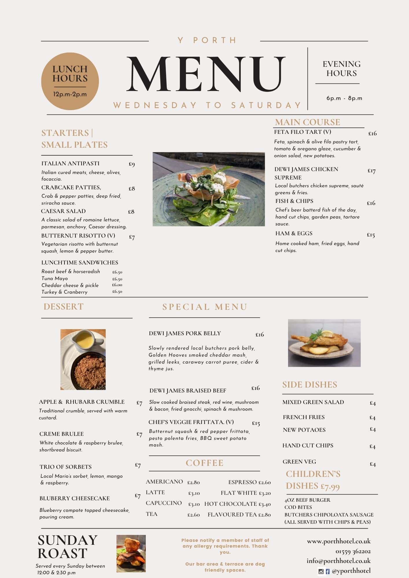 Lunch & Evening menu served Wednesday – Saturday 12-2pm & 6-8pm